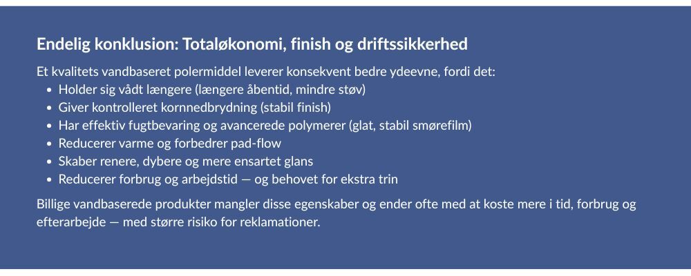 Vandbaserede polerprodukter er i hastig udvikling. De leverer i dag høj ydeevne, lavere lugt, lavere VOC og renere arbejdsmiljø. Men forskellen mellem et kvalitetsprodukt og et billigt produkt er markant — især på smøreevne, kornnedbrydning, fordampningskontrol og varmehåndtering.