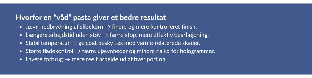 - Reducerer varme, giver roligt pad-flow og større kontrol, især på hård gelcoat.
