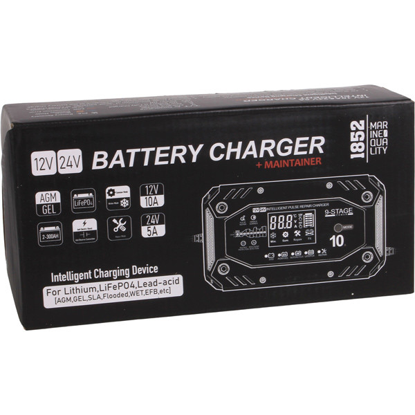 1852 Smartlader 10A 12/24V er en alsidig og intelligent batterioplader med automatisk spændingsgenkendelse og LCD-display, der viser spænding, strøm og ladestatus. Den understøtter flere ladeprogrammer til STD, AGM/GEL, LiFePO4/Lithium og MC samt en reparationsfunktion til regenerering af dybt afladede batterier. Med indbygget beskyttelse mod omvendt polaritet, kortslutning og overbelastning er den ideel til store biler, varevogne og bådbatterier med kapacitet på 50-100 Ah.