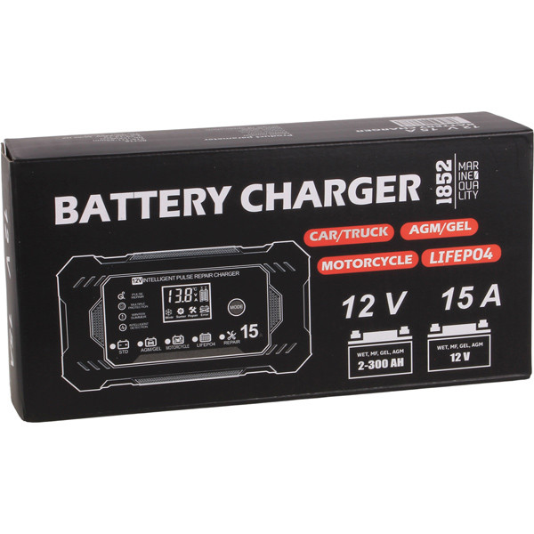 1852 Smart Charger 15A 12V er en kraftfuld og intelligent batterioplader med LCD-display, der viser spænding, strøm og ladestatus. Den har flere opladningsprogrammer til STD, AGM/GEL, MC og LiFePO4/Lithium samt en reparationsfunktion, der forlænger batteriets levetid. Med indbygget beskyttelse mod omvendt polaritet og kortslutning er den ideel til varevogne, campingvogne, solcelleanlæg og store bådbatterier med kapacitet på 75-150 Ah.