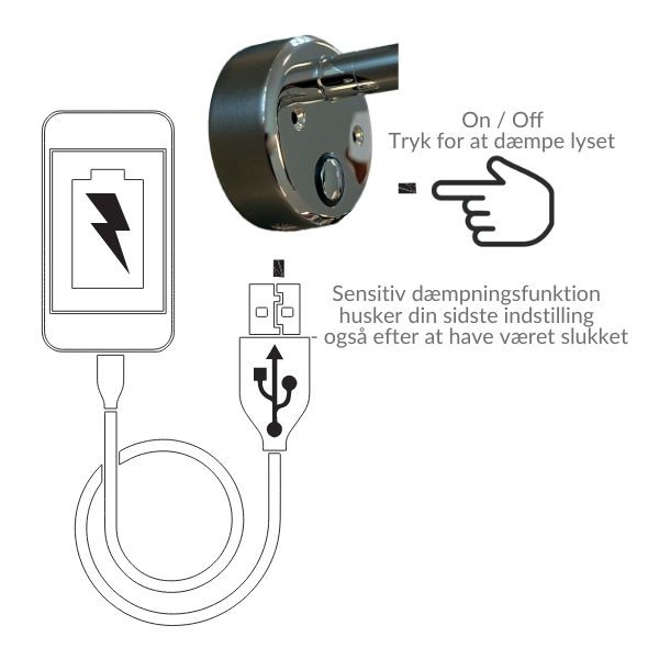 Med indbygget sensitivt lysdæmpningssystem og USB oplader.