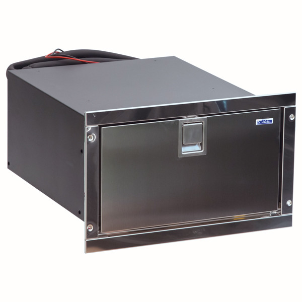 Køleskuffen installeres plan i møbler eller konsoller og leveres med ramme til indbygning på alle fire sider. Den er kompatibel med almindelige 12/24 V elsystemer ombord og kan anvendes i cockpit, pantry, kahyt eller under sæder.
