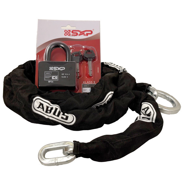 Låsepakke med hængelås fra SXP og Abus låsekæde med nylonbetræk på 2,5 meter