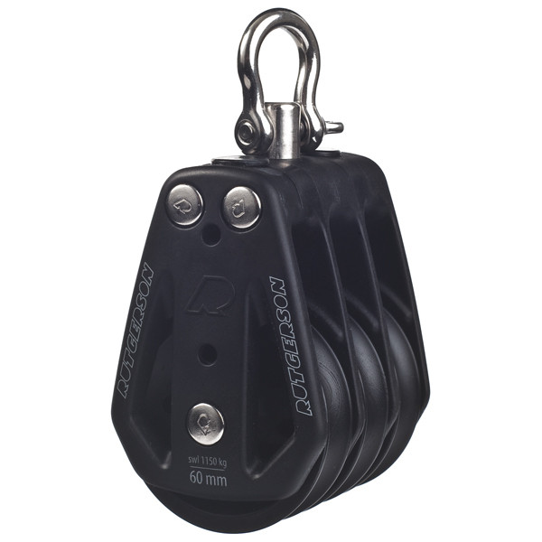 Denne trippelblok bruges i udvekslings‑ og trimfunktioner, hvor du ønsker høj mekanisk fordel og præcis kontrol over lineføringen. Den er relevant for sejlere, der arbejder med storskødeudveksling, fintrim eller andre belastede systemer, hvor tre skiver giver lettere træk og en mere afbalanceret lineføring. Blokken indgår naturligt i både cruising‑ og kapsejladsrigge.Trippelblokken er opbygget med tre kompositskiver og kompositsider, som giver lav vægt og god styrke. Den benytter et sfærisk glideleje, der sikrer jævn rotation og lav friktion, selv når linen belastes hårdt. Konstruktionen er udviklet til stabil drift i maritimt miljø. Enkelte modeller har et roterende hoved, som gør det muligt for blokken at følge liner i skiftende trækretninger.