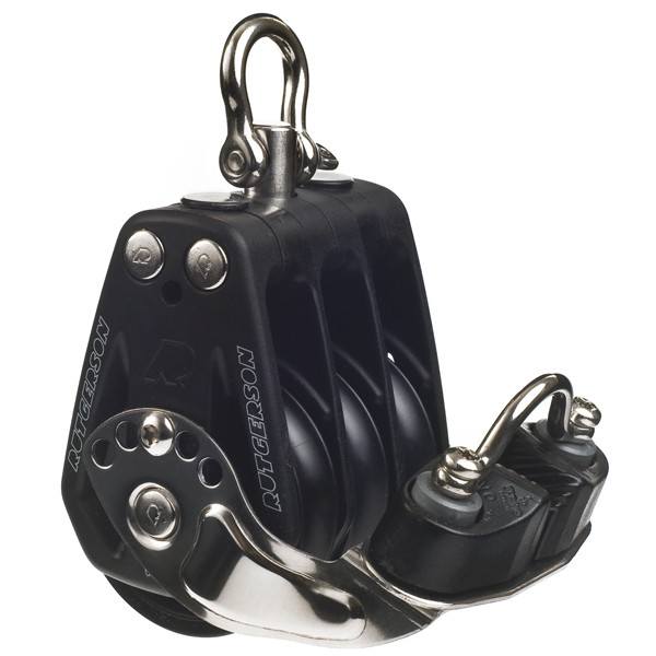 Denne trippelblok med frølår bruges i udvekslings- og trimopgaver, hvor du har brug for både høj mekanisk fordel og mulighed for hurtig fastlåsning af linen. Den henvender sig til sejlere, der foretager hyppige justeringer og ønsker en kompakt løsning med både udveksling og låsefunktion. Trippelblokkens opbygning giver et kontrolleret og stabilt træk i systemet.Blokken har tre skiver, der deler belastningen og giver en jævn udveksling i systemet. Den arbejder med et sfærisk glideleje og kompositsider og -skiver, som sikrer jævn rotation og stabil gang under belastning. Nogle modeller har et roterende hoved, der kan følge linen i skiftende trækretninger. Frølåret giver mulighed for hurtigt at fæstne linen uden brug af ekstra beslag, hvilket gør trimarbejdet mere effektivt og præcist.