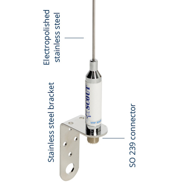 Antennen monteres med det medfølgende rustfri beslag, som giver en sikker fastgørelse på masten. SO‑239‑connectoren gør installationen enkel og kompatibel med standard maritimt VHF‑udstyr.