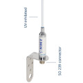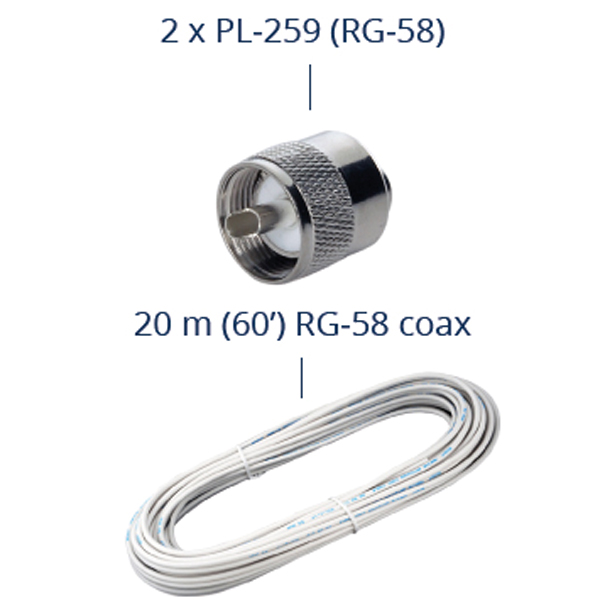 Sættet leveres med rustfrit monteringsbeslag og SO‑239 stik, så installationen bliver enkel og stabil. Med det inkluderede 20 m kabel kan antennen monteres i mastetoppen på de fleste sejlbåde uden behov for ekstra forlængere.